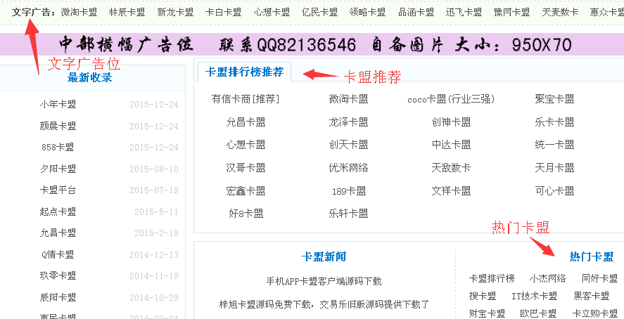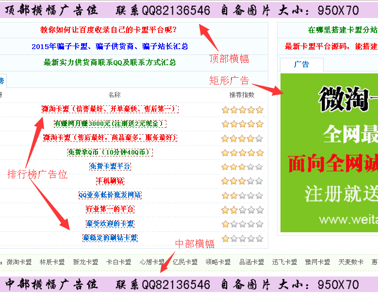 文字置顶广告位(顶部横幅上面的):第一行文字800元,其他500元/月,按购买先后排序